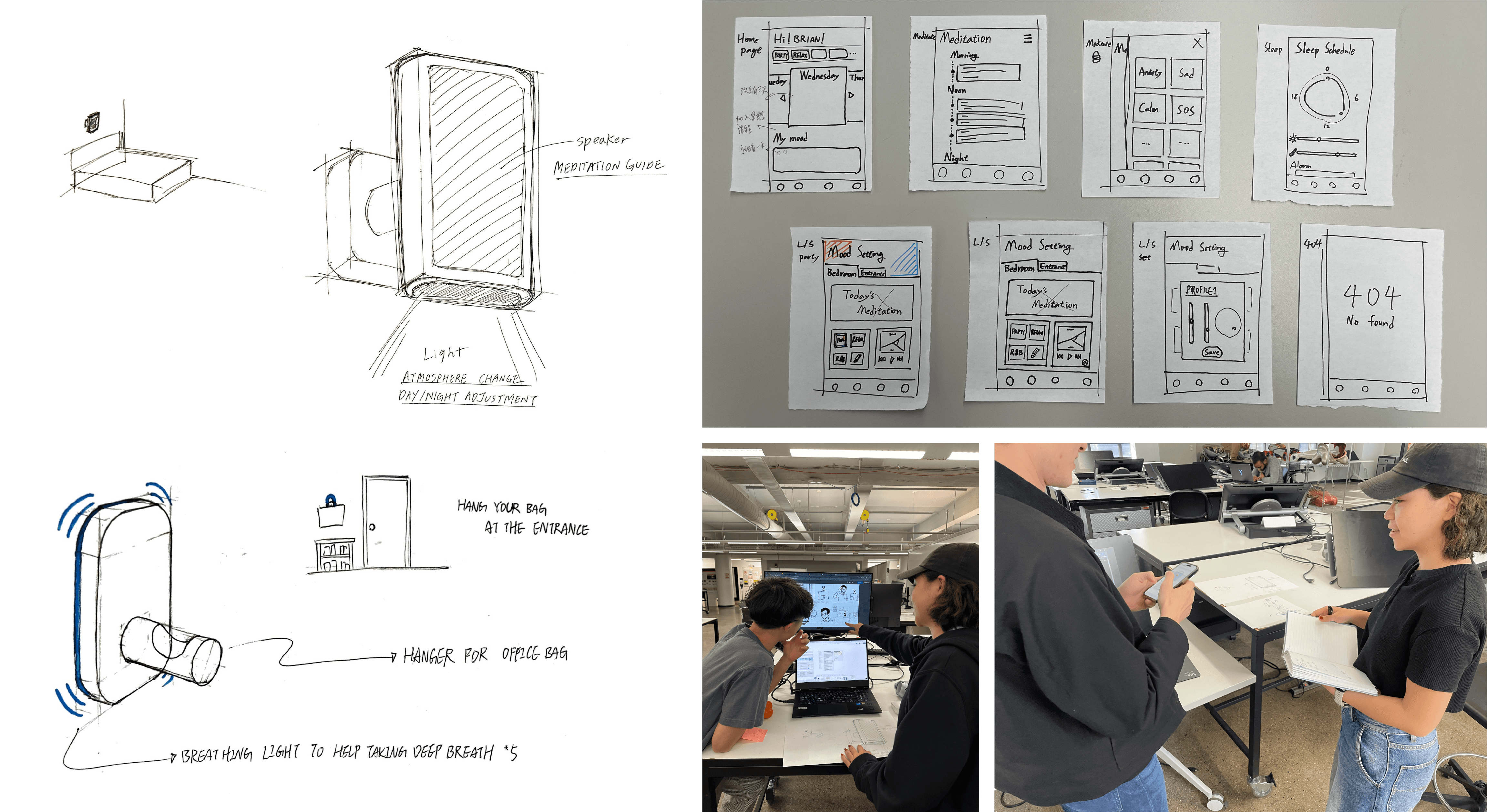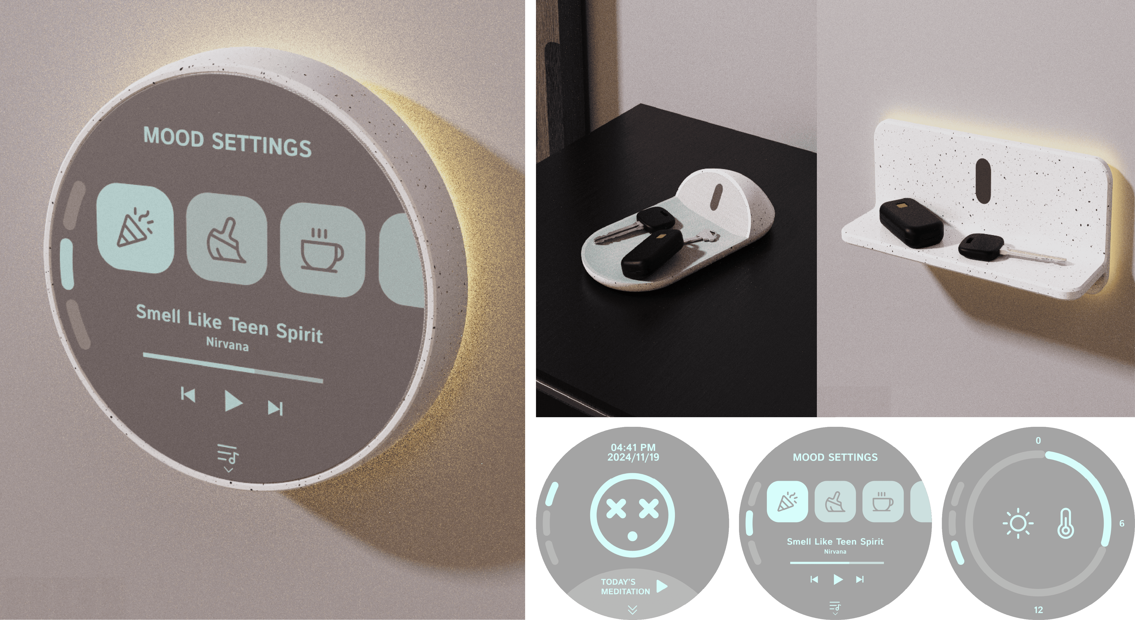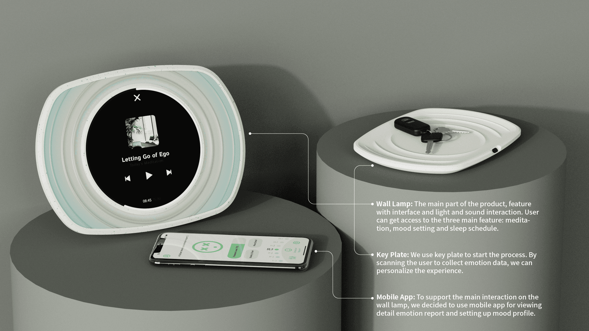 After activation, the wall lamp will display the emotional status to the user, with suggestions for meditation exercises. The user can start meditation with the immersive sound and light effect.